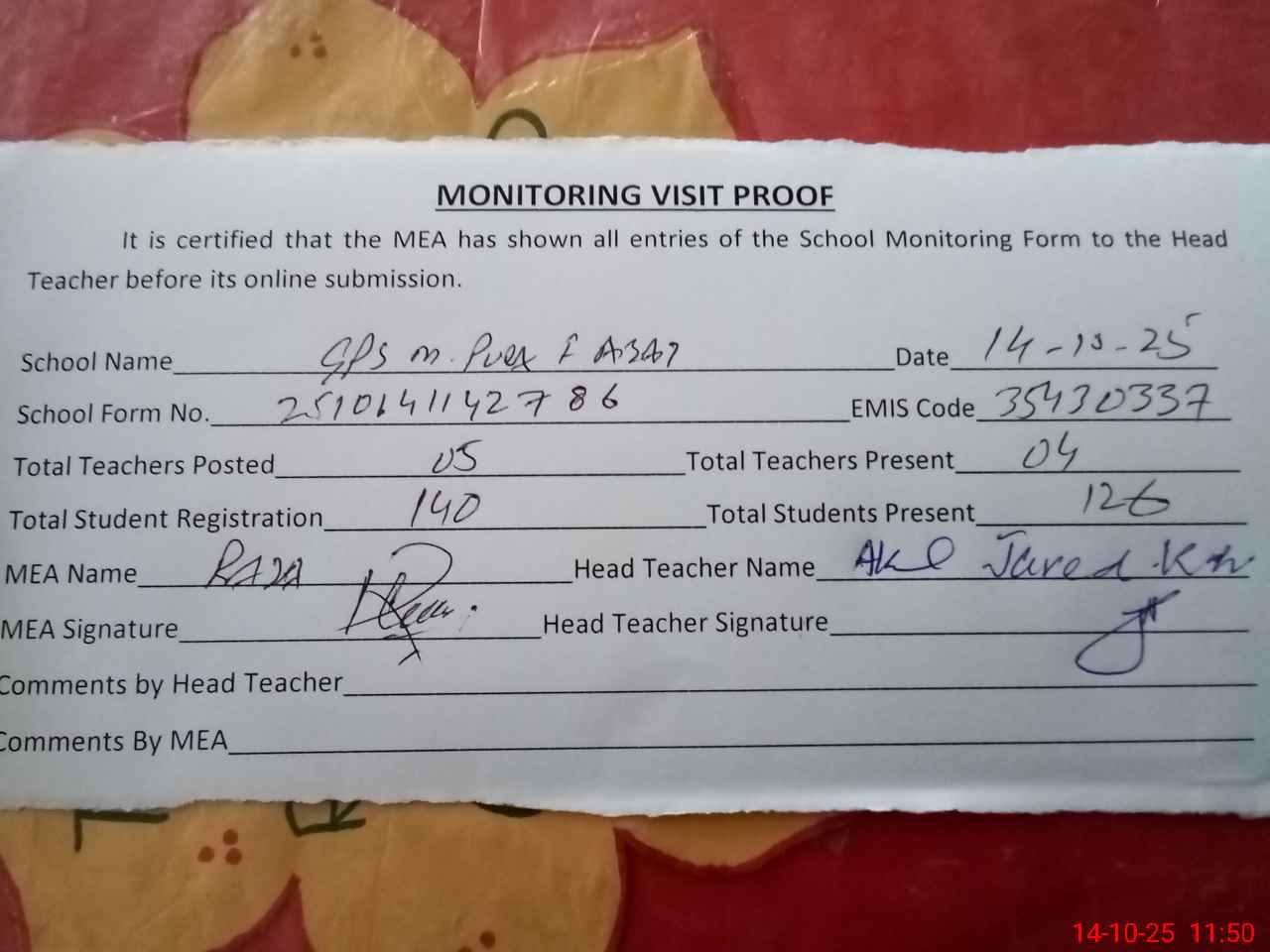 | Attendance Register | Head Teacher | MEA with School | Visit Proof |