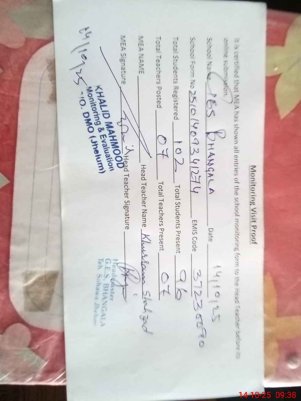 | Certified that this School was Inspected by the Undersigned MEA/DMO Today and the Information Stated Above is as Per Record. | |||||