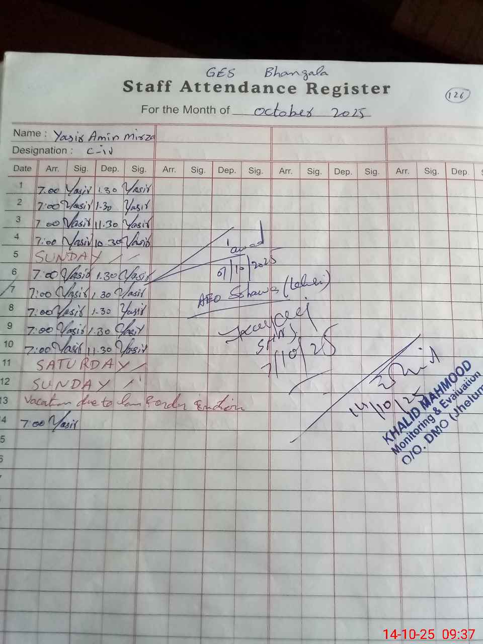 | Monitoring Date: 14-10-2025 | Start Time: 14-10-2025 09:23 AM | End Time: 14-10-2025 11:17 AM | Name of MEA: KH**** ME**** | |