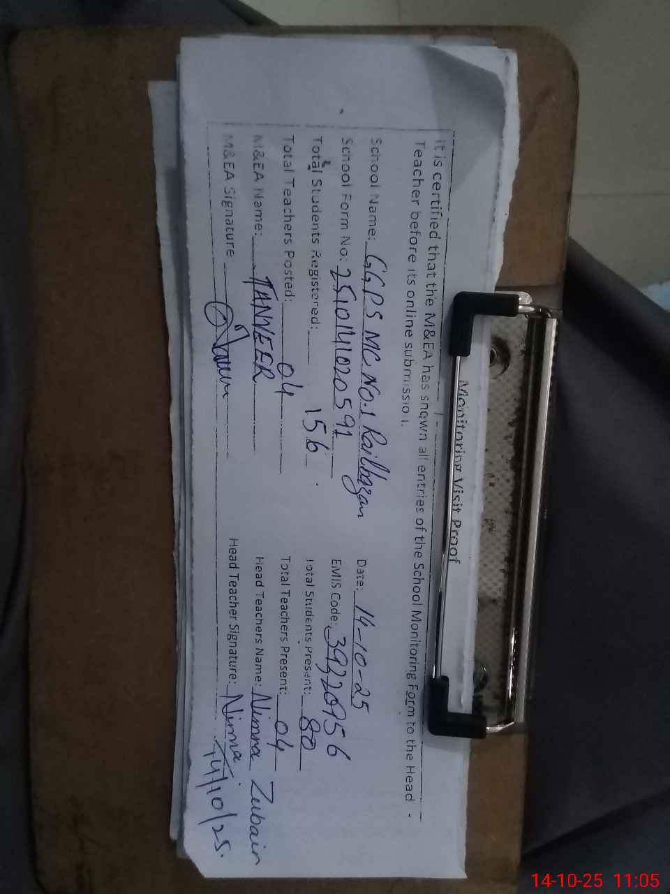 | Attendance Register | Head Teacher | MEA with School | Visit Proof |