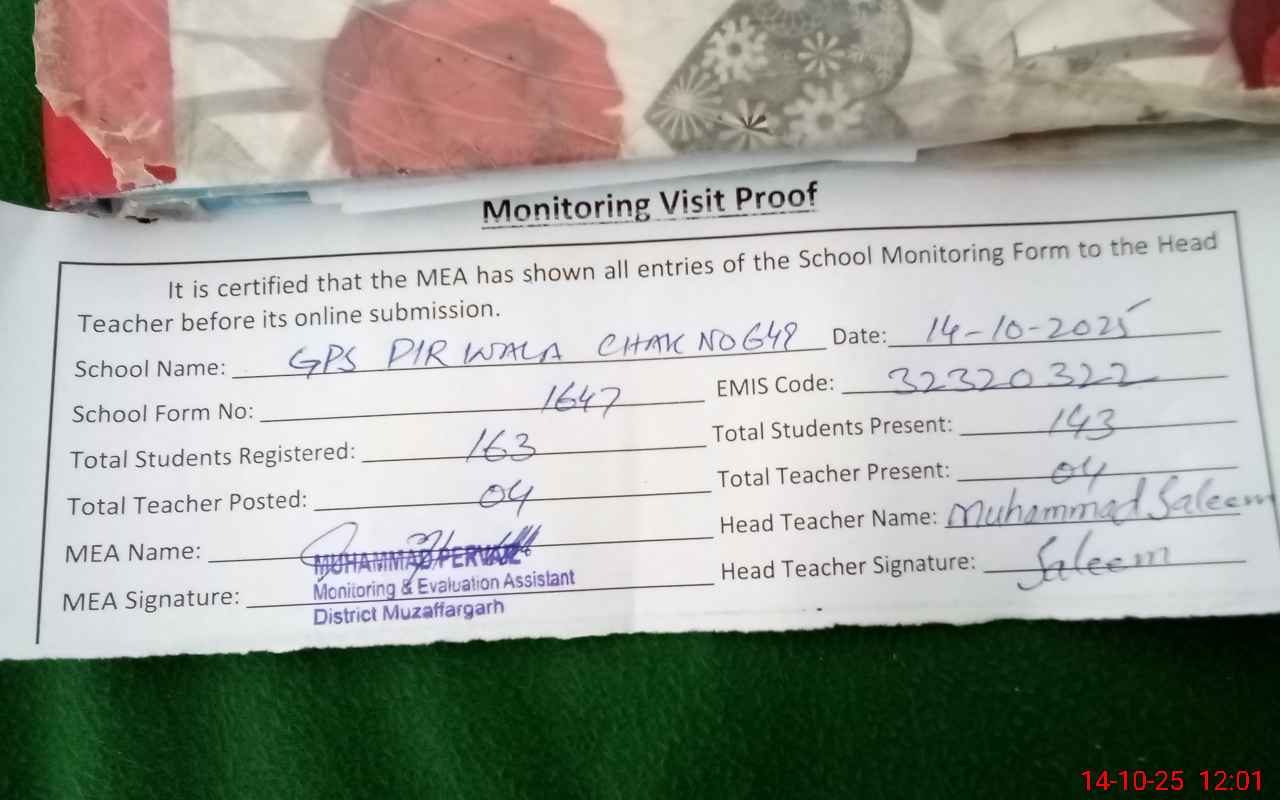 | EMIS Code: 32320322 | Name of School: GPS PIR WALA (CHAK NO. 649/TDA) | |||