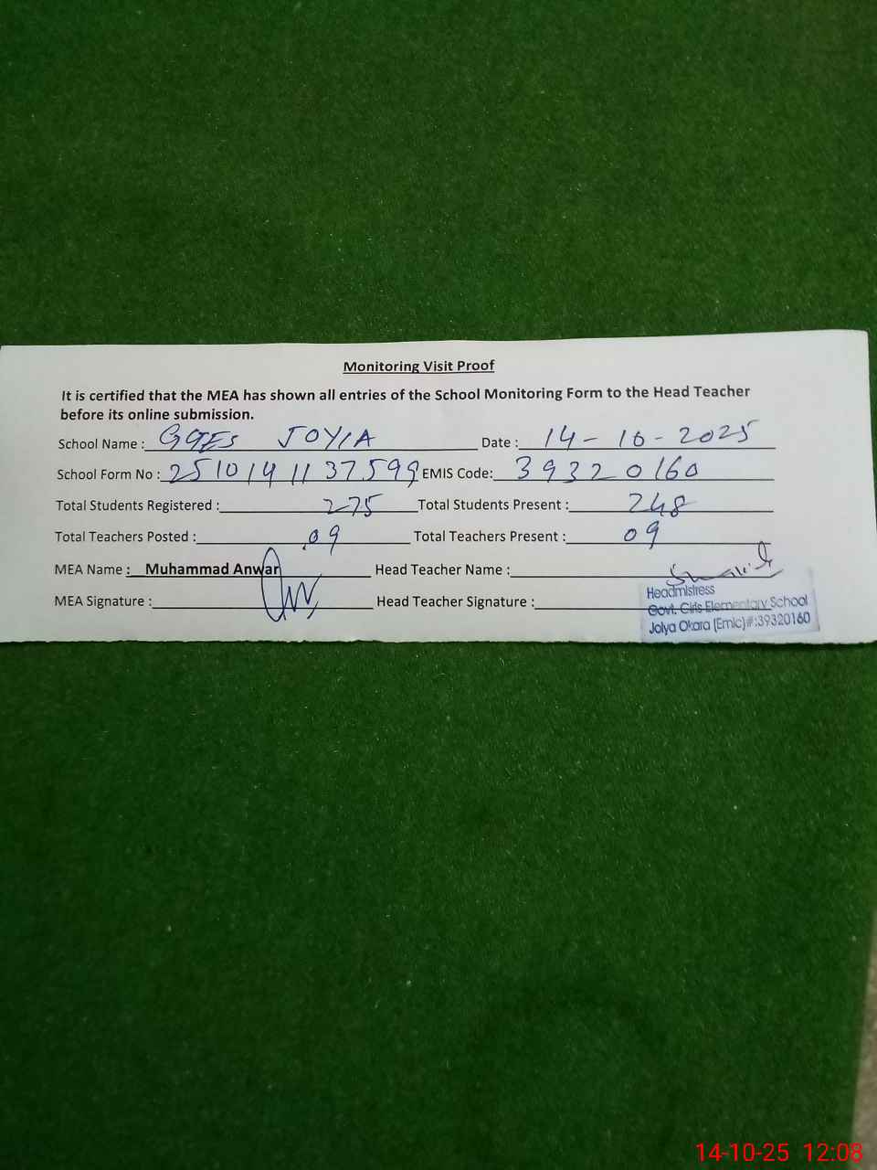 | District: OKARA | Tehsil: OKARA | Markaz: JOIYA - FEMALE | Level: Middle | |
