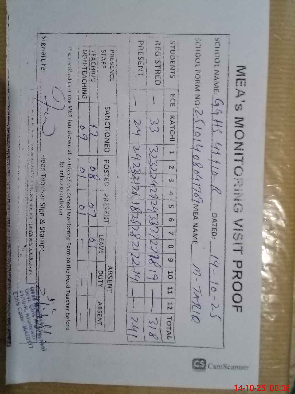 | Attendance Register | Head Teacher | MEA with School | Visit Proof |