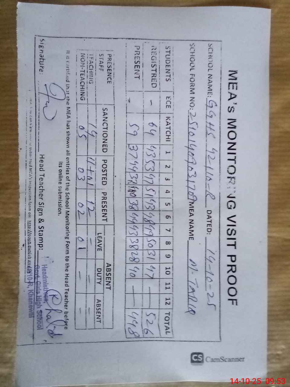 | Attendance Register | Head Teacher | MEA with School | Visit Proof |