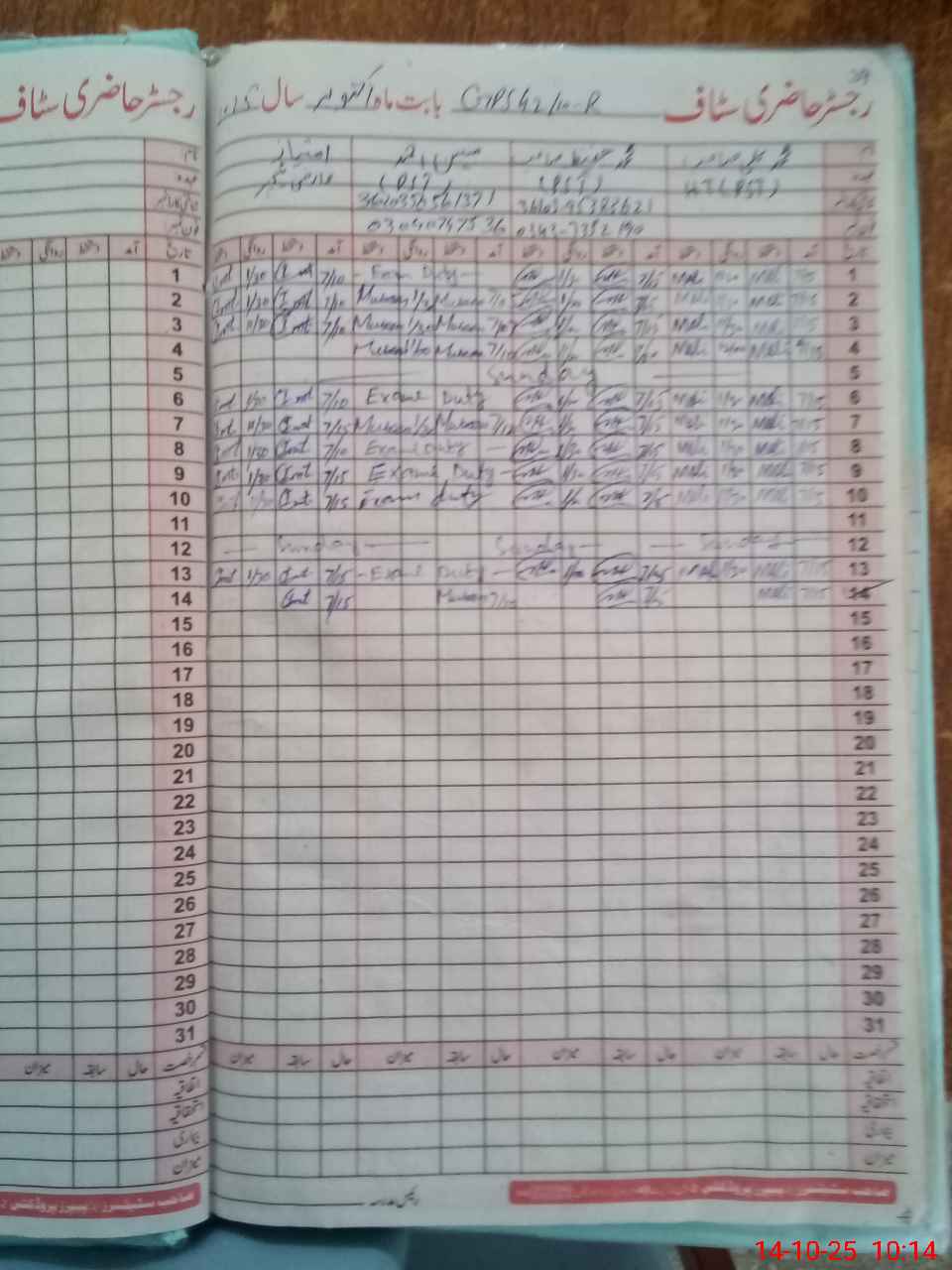 | CNIC | Full Name | Designation | R/C | Absence During Last Calender Month |
