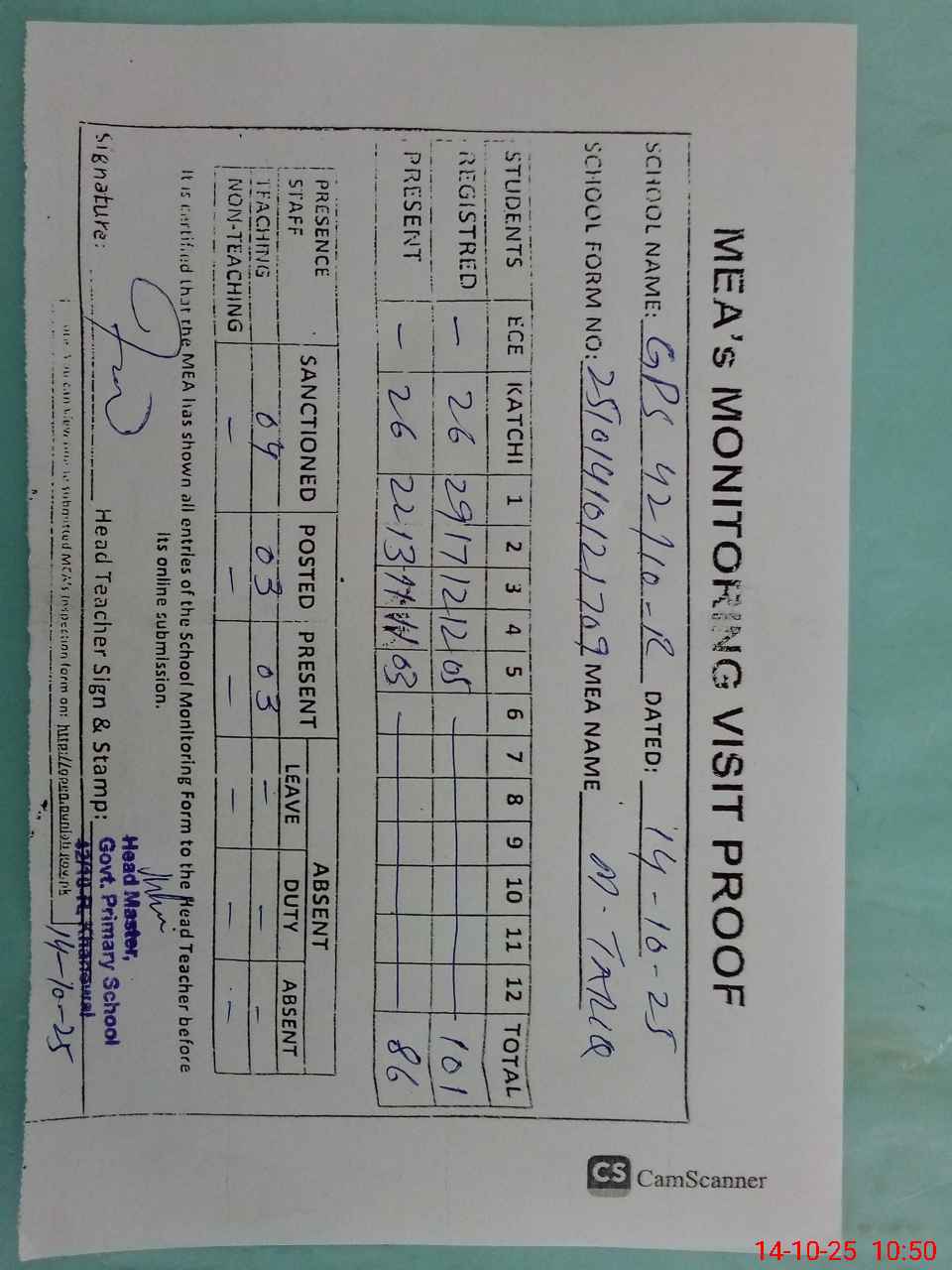 | Attendance Register | Head Teacher | MEA with School | Visit Proof |