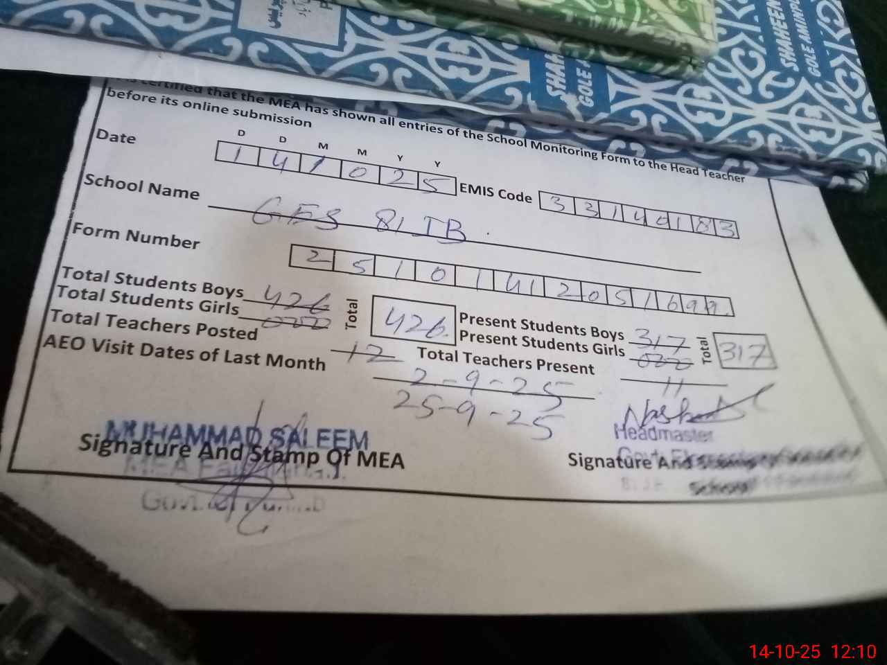 | Attendance Register | Head Teacher | MEA with School | Visit Proof |