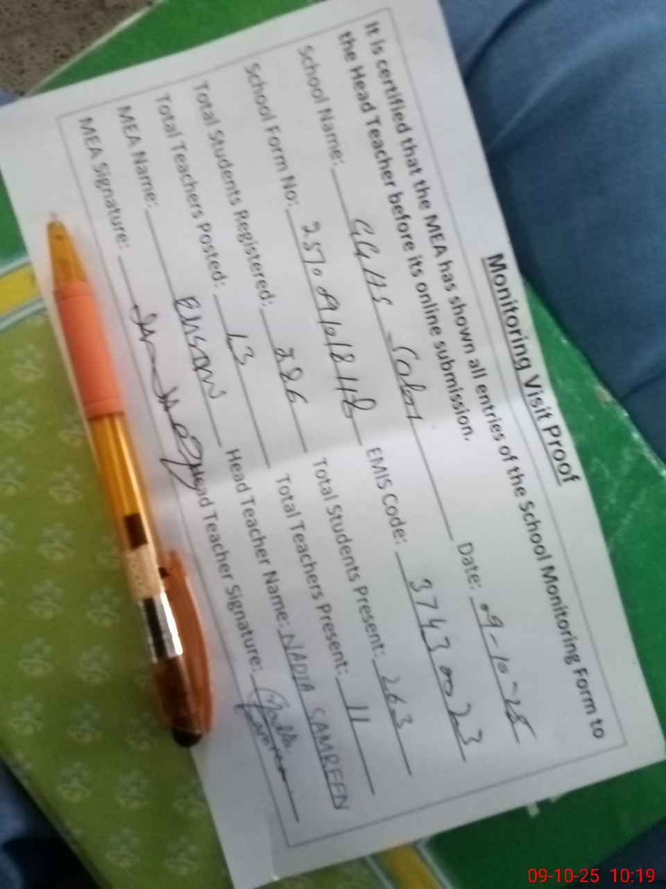 | Attendance Register | Head Teacher | MEA with School | Visit Proof |
