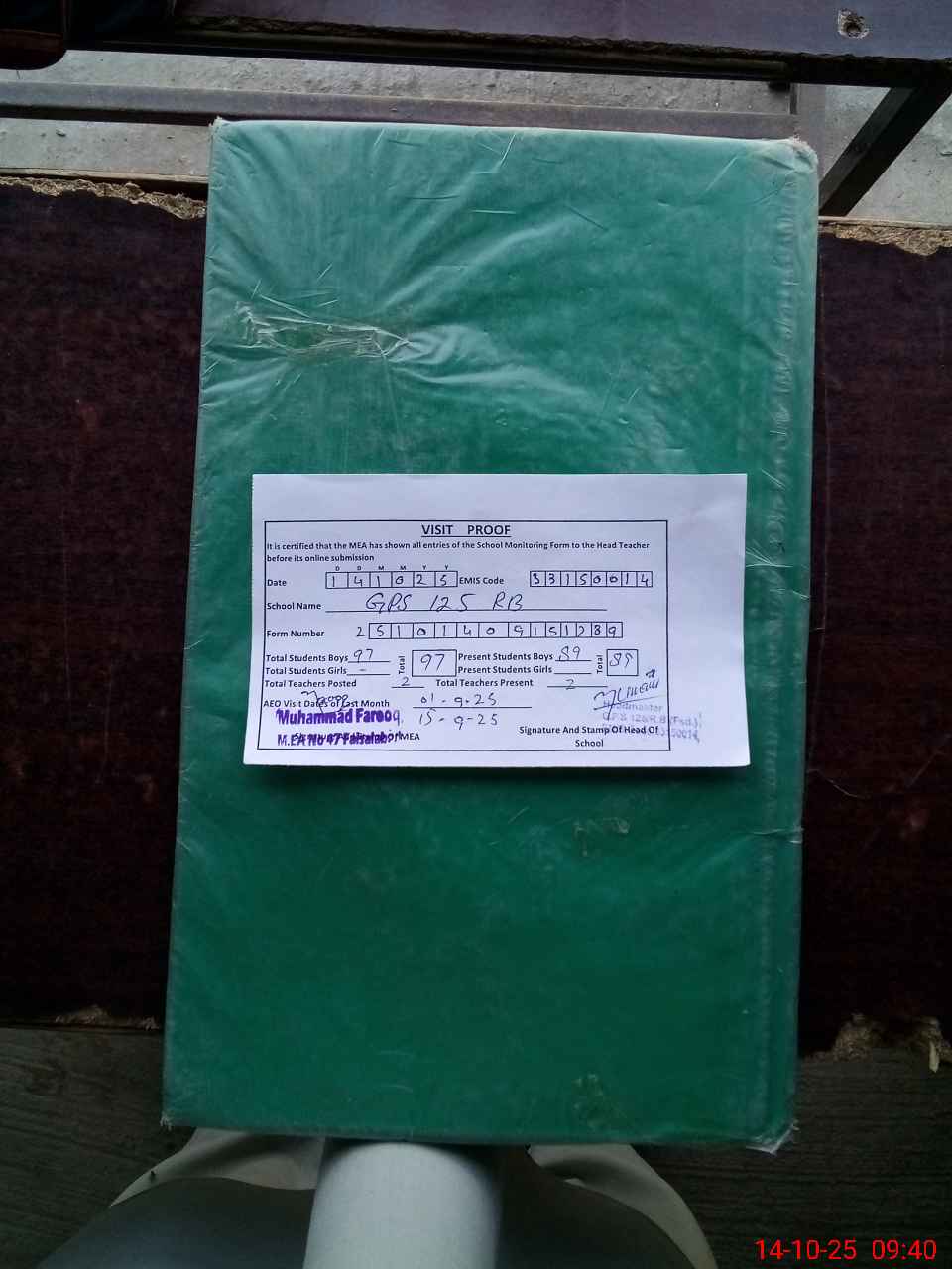 | Attendance Register | Head Teacher | MEA with School | Visit Proof |