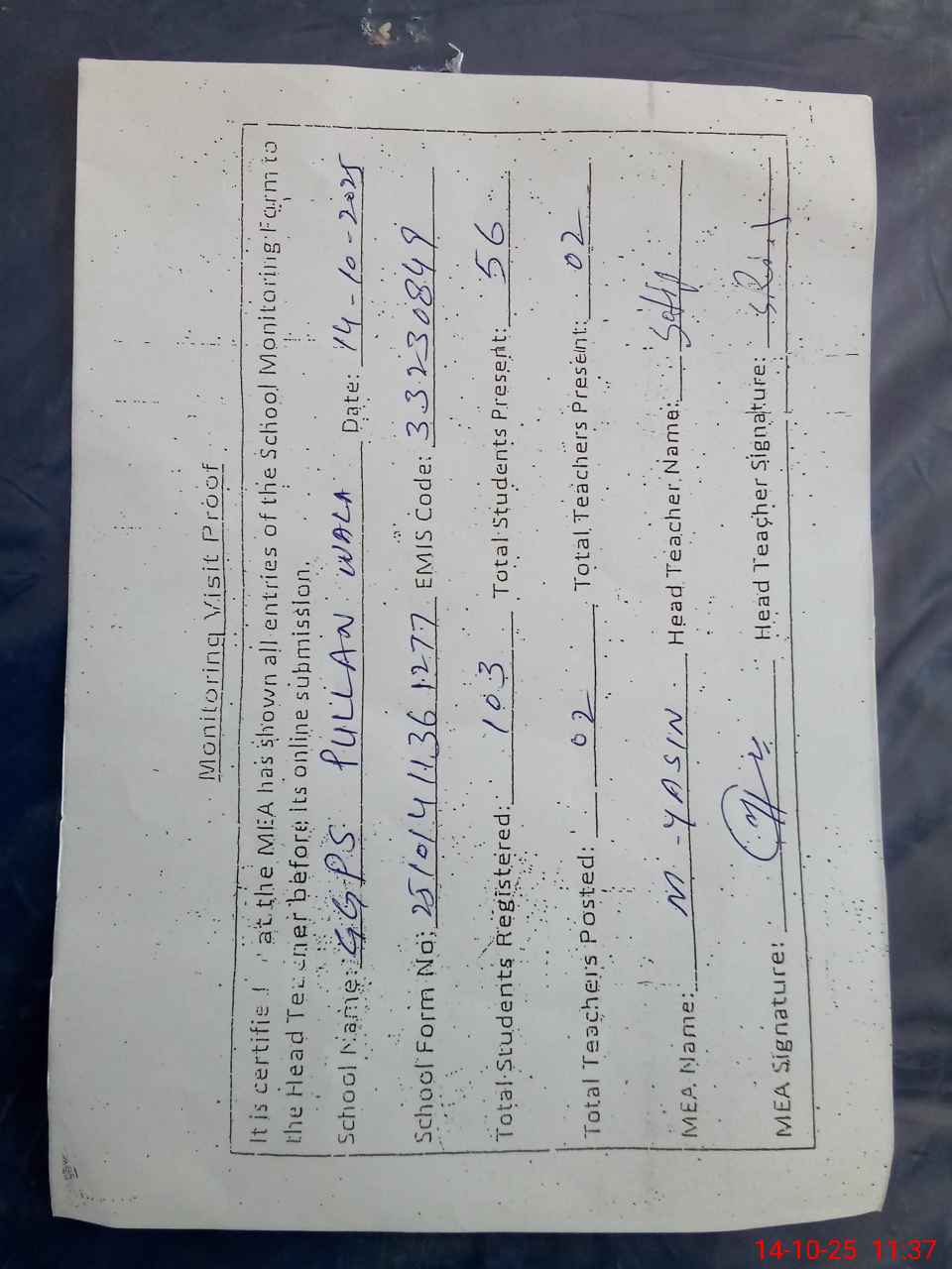 | Attendance Register | Head Teacher | MEA with School | Visit Proof |