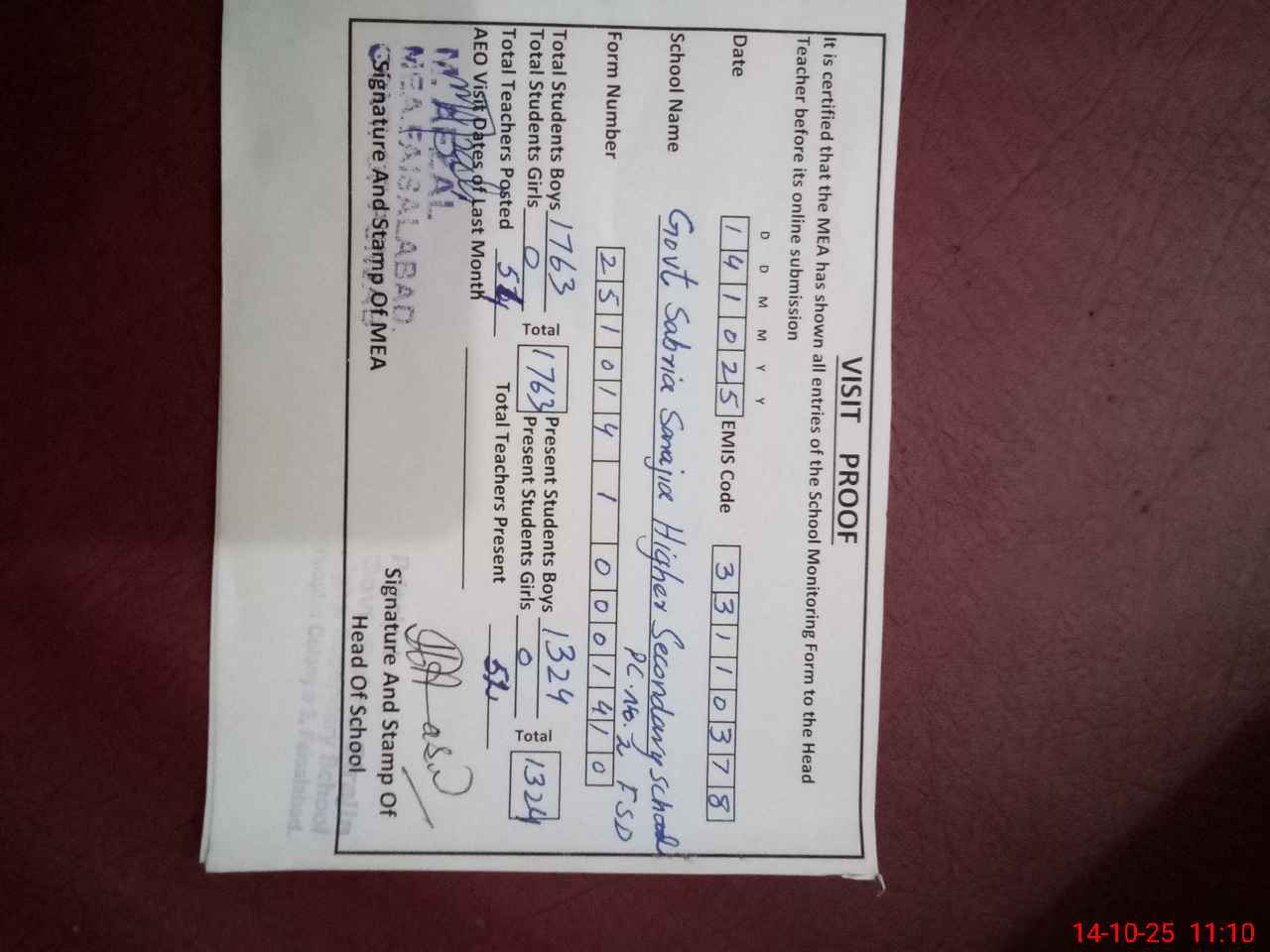 | EMIS Code: 33110378 | Name of School: GHSS SABRIA SIRAJIA PEOPLES COLONY NO. 2 FSD | |||