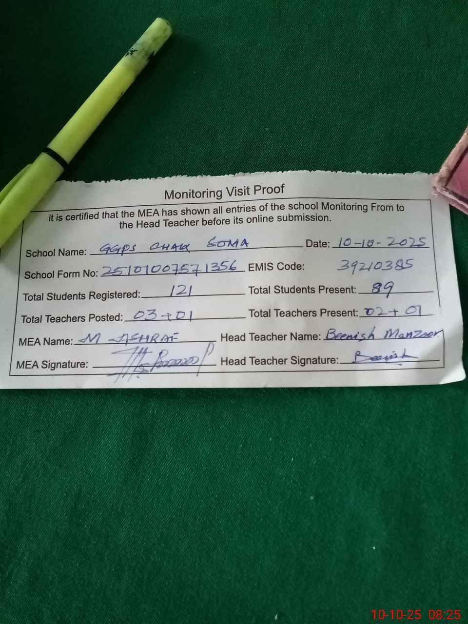 | Monitoring Date: 10-10-2025 | Start Time: 10-10-2025 07:56 AM | End Time: 10-10-2025 08:25 AM | Name of MEA: MU**** AS**** | |