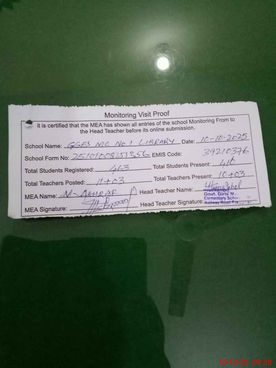 | EMIS Code: 39210376 | Name of School: GGES MC NO. 1 LIBRARY RAILWAY ROAD | |||