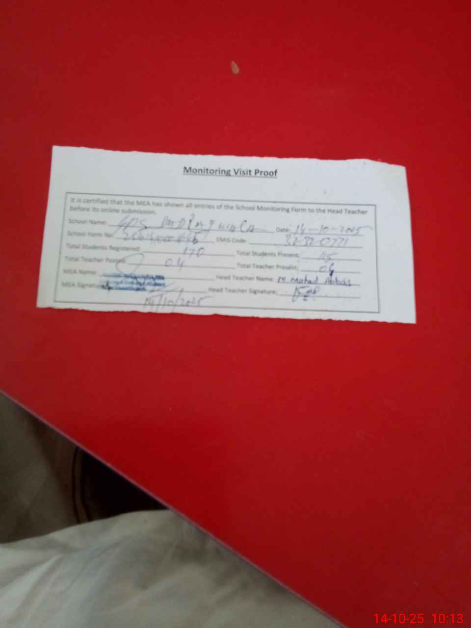 | Attendance Register | Head Teacher | MEA with School | Visit Proof |