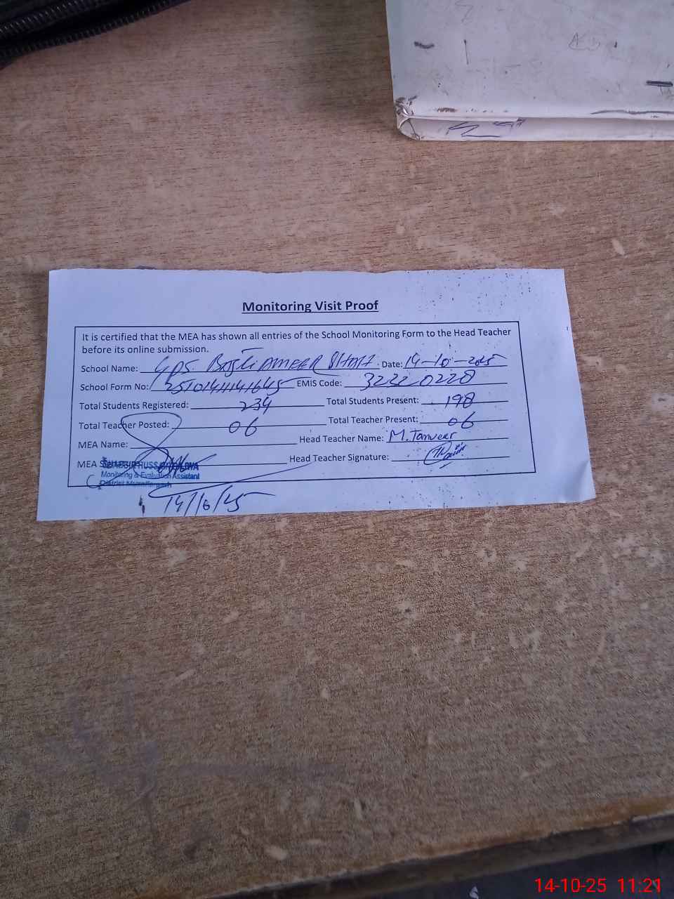 | Attendance Register | Head Teacher | MEA with School | Visit Proof |