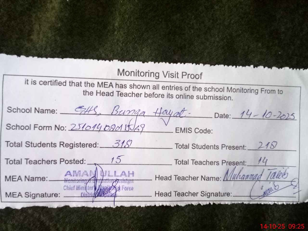 | Attendance Register | Head Teacher | MEA with School | Visit Proof |