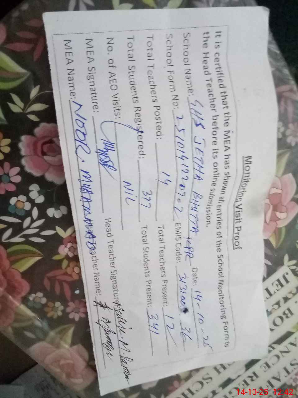 | Certified that this School was Inspected by the Undersigned MEA/DMO Today and the Information Stated Above is as Per Record. | |||||