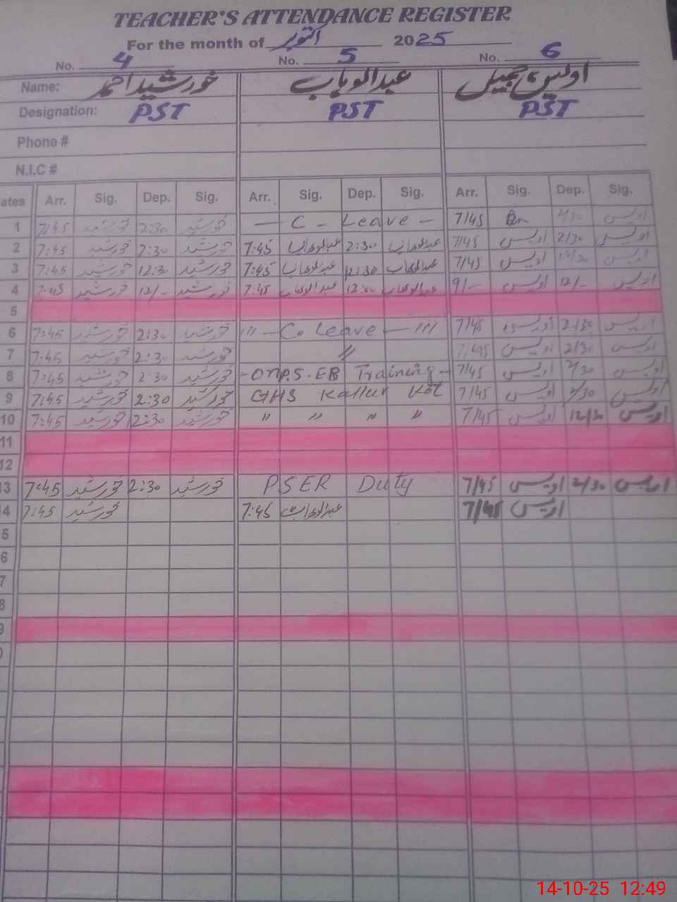 | CNIC | Full Name | Designation | R/C | Absence During Last Calender Month |