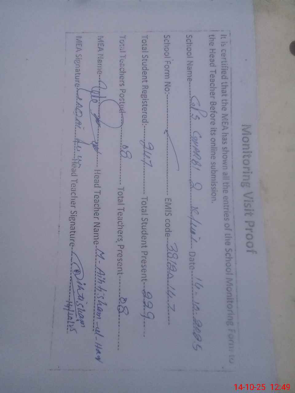 | Certified that this School was Inspected by the Undersigned MEA/DMO Today and the Information Stated Above is as Per Record. | |||||