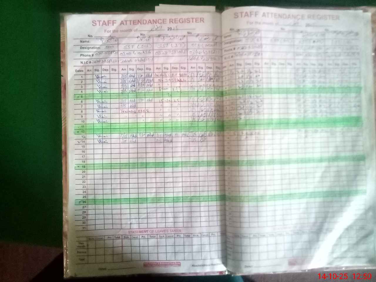 | CNIC | Full Name | Designation | R/C | Absence During Last Calender Month |