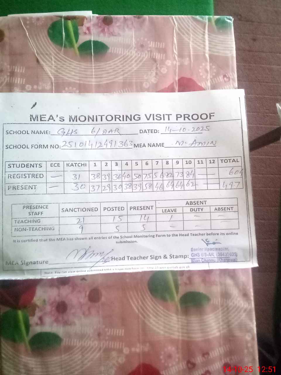 | Certified that this School was Inspected by the Undersigned MEA/DMO Today and the Information Stated Above is as Per Record. | |||||