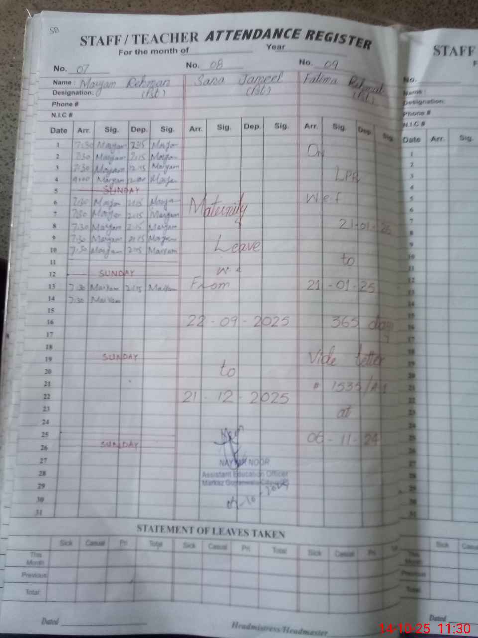 | CNIC | Full Name | Designation | R/C | Absence During Last Calender Month |