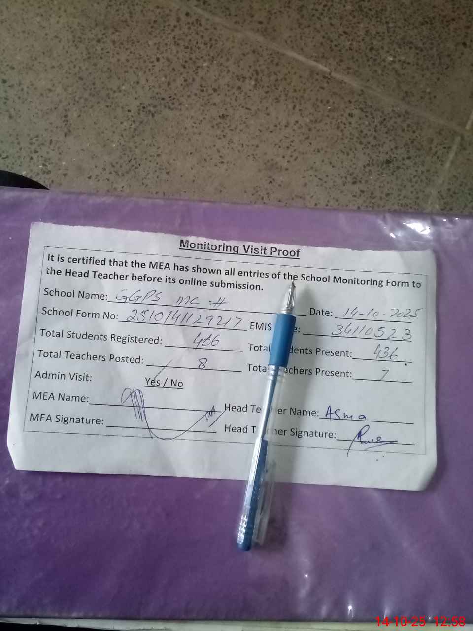 | Attendance Register | Head Teacher | MEA with School | Visit Proof |