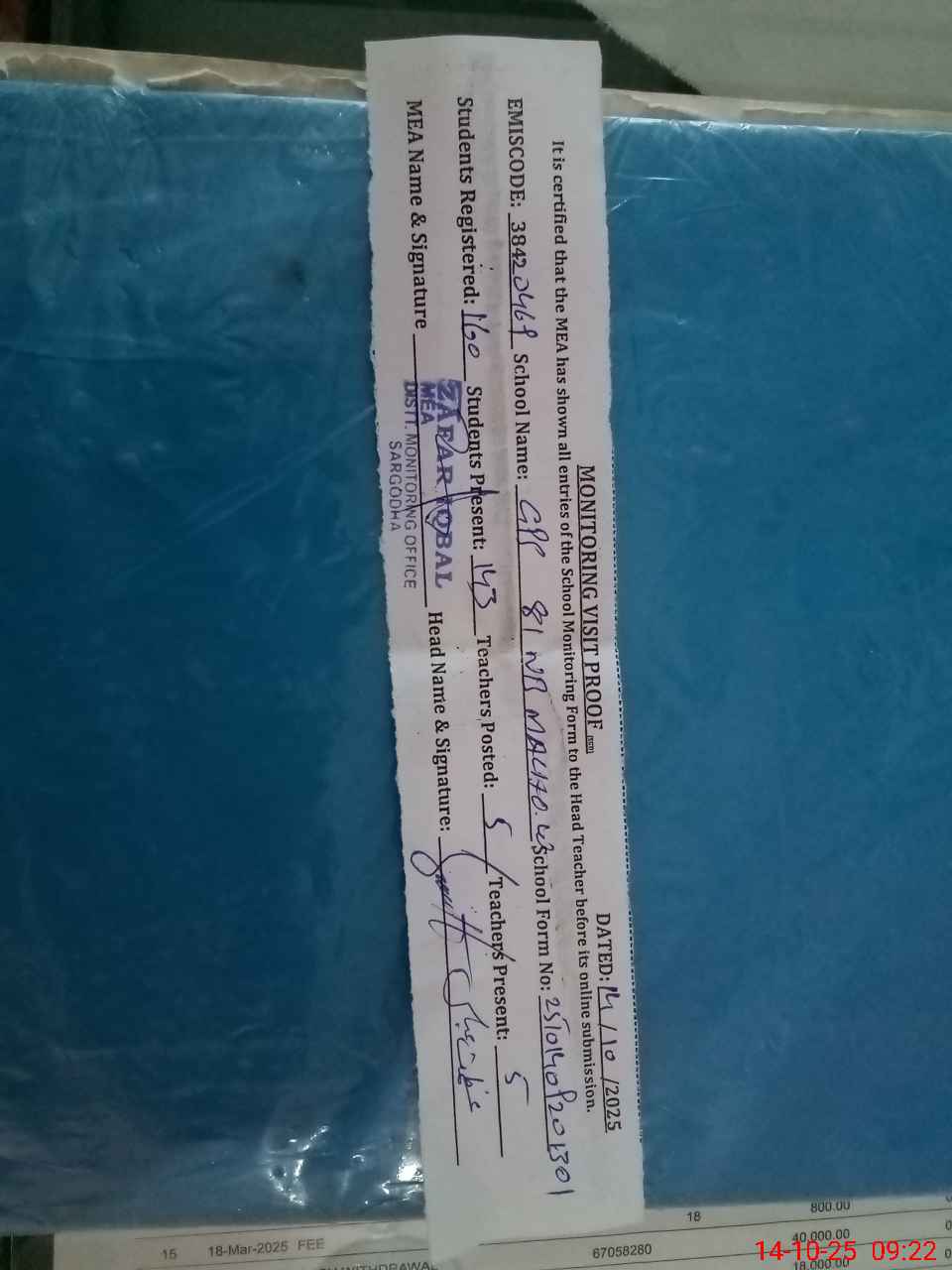 | Monitoring Date: 14-10-2025 | Start Time: 14-10-2025 08:39 AM | End Time: 14-10-2025 09:23 AM | Name of MEA: ZA**** IQ**** | |