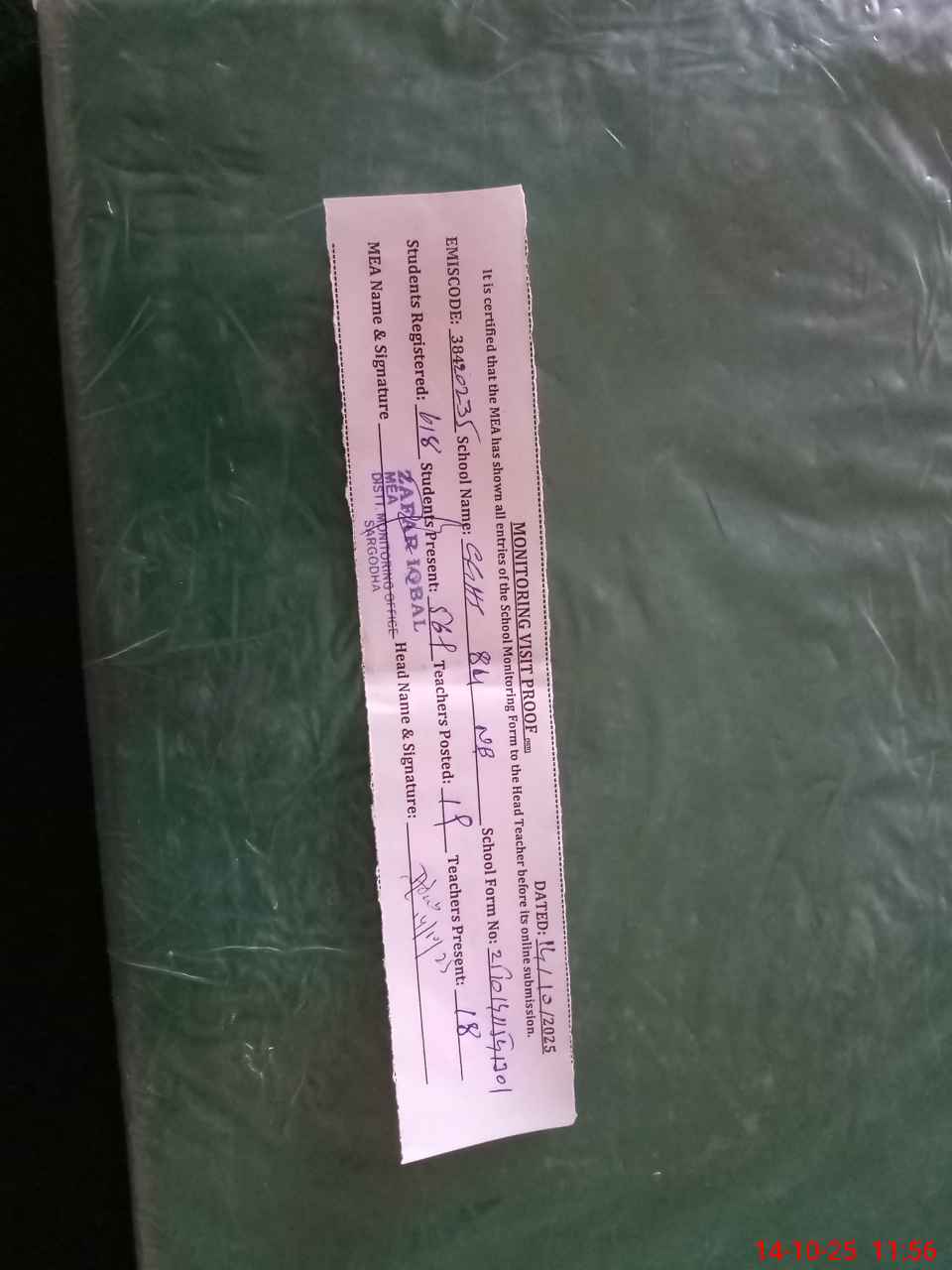 | Certified that this School was Inspected by the Undersigned MEA/DMO Today and the Information Stated Above is as Per Record. | |||||