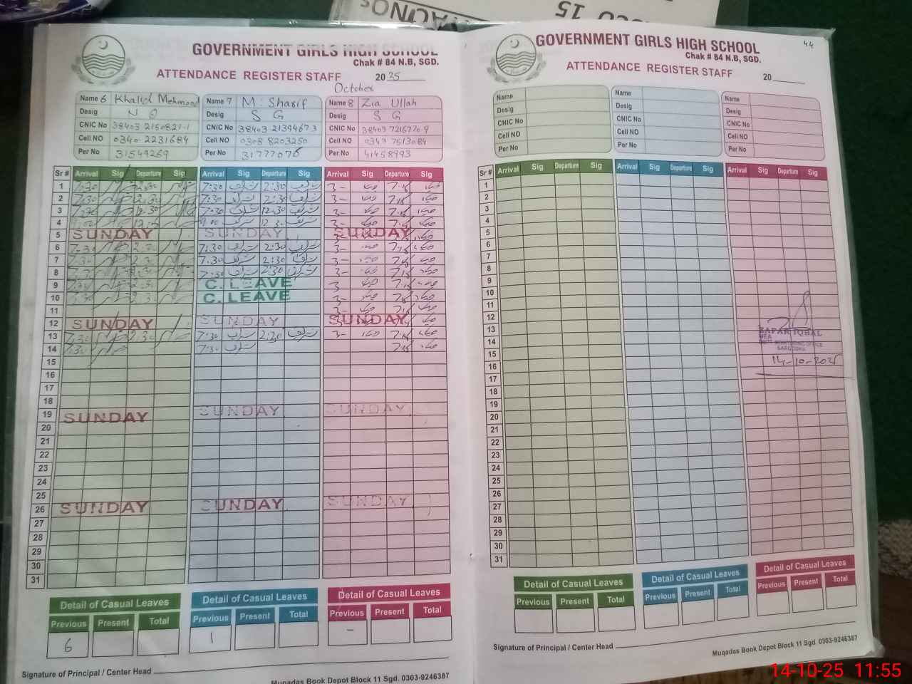 | CNIC | Full Name | Designation | R/C | Absence during last cal. month |