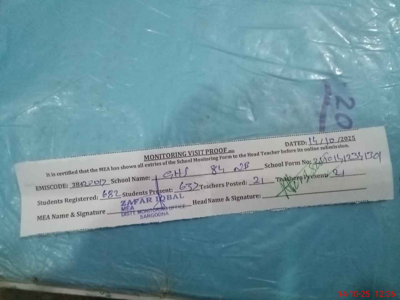 | Attendance Register | Head Teacher | MEA with School | Visit Proof |