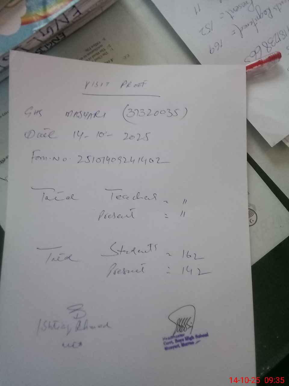 | Attendance Register | Head Teacher | MEA with School | Visit Proof |