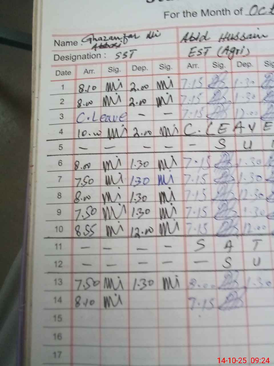 | CNIC | Full Name | Designation | R/C | Absence During Last Calender Month |