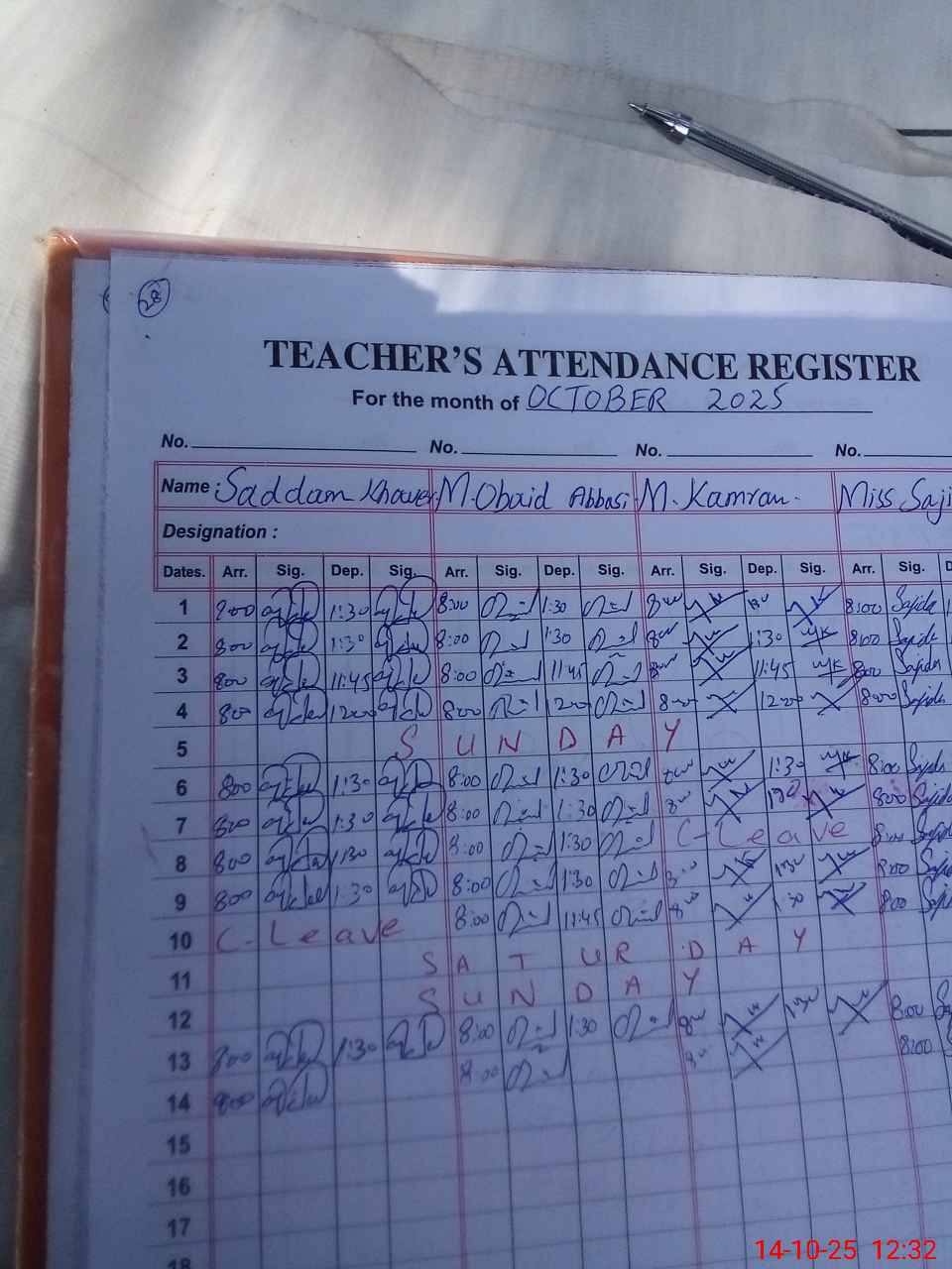 | CNIC | Full Name | Designation | R/C | Absence During Last Calender Month |