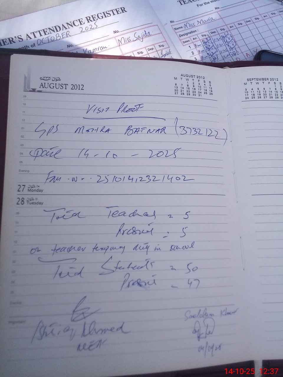 | Attendance Register | Head Teacher | MEA with School | Visit Proof |