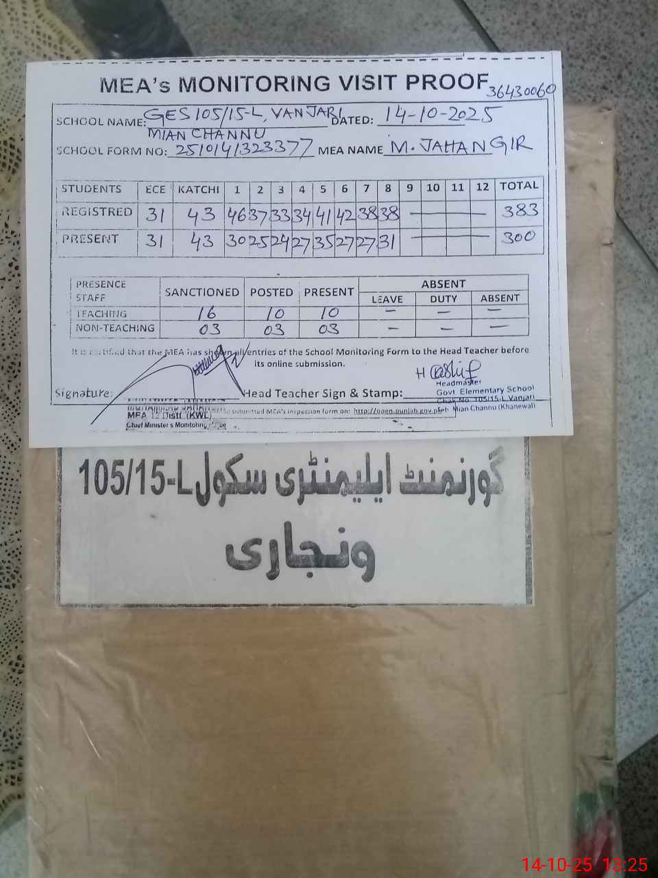 | EMIS Code: 36430060 | Name of School: GES 105/15-L MIAN CHANNU | |||