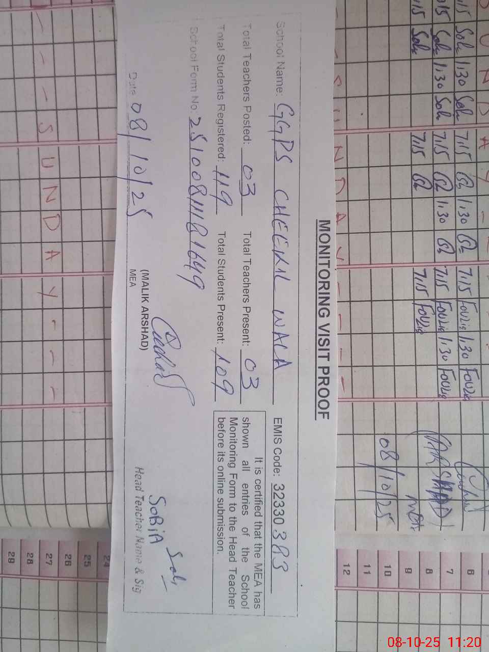 | Attendance Register | Head Teacher | MEA with School | Visit Proof |