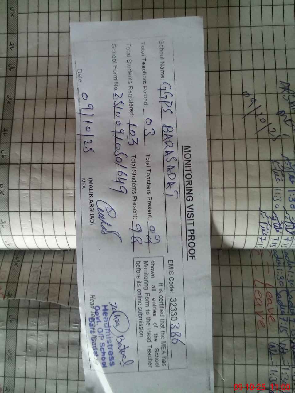| Attendance Register | Head Teacher | MEA with School | Visit Proof |