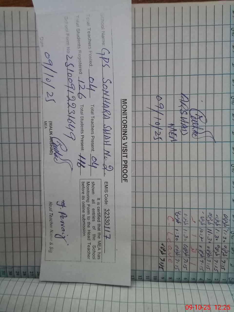 | Attendance Register | Head Teacher | MEA with School | Visit Proof |