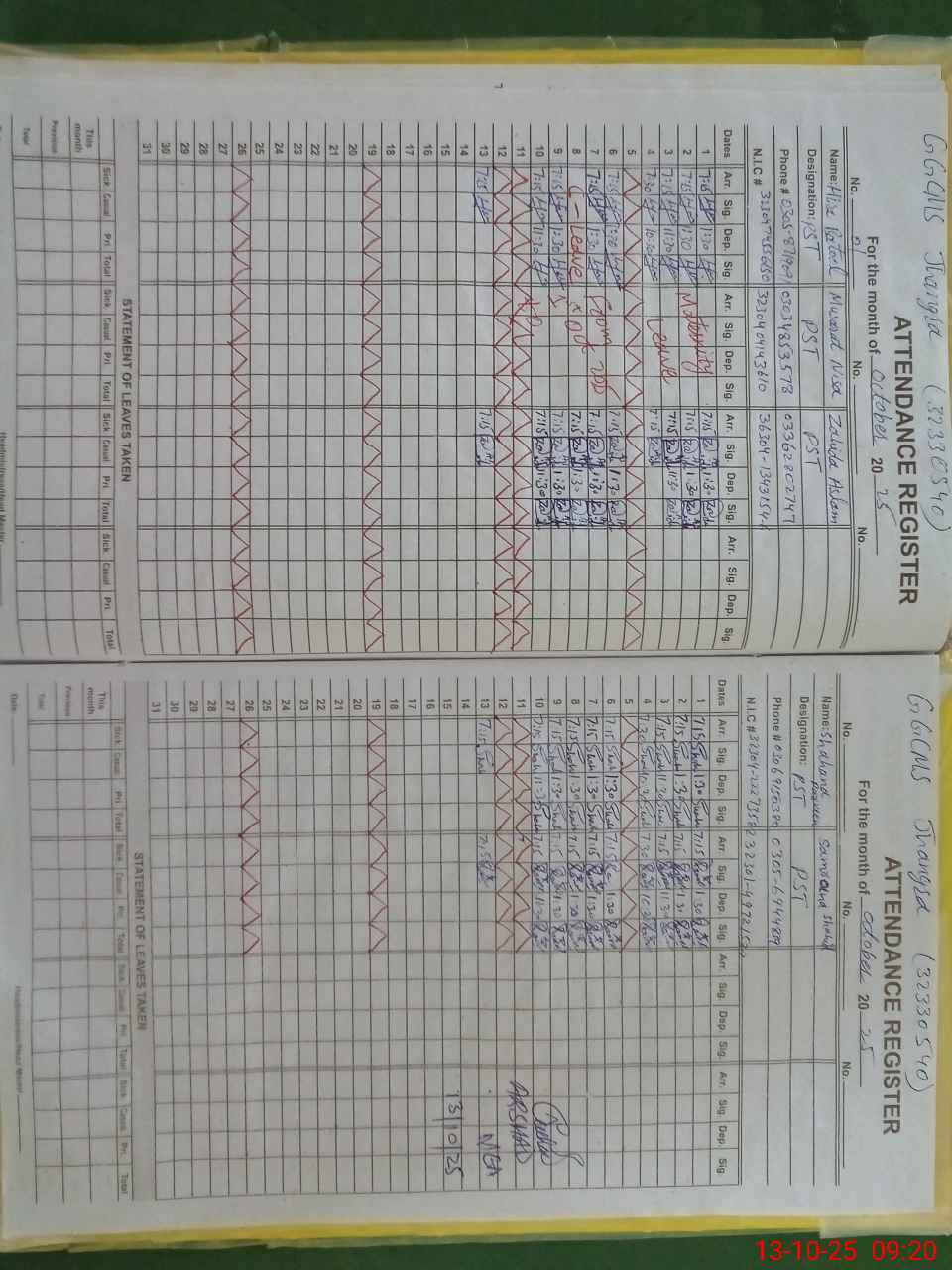 | CNIC | Full Name | Designation | R/C | Absence During Last Calender Month |