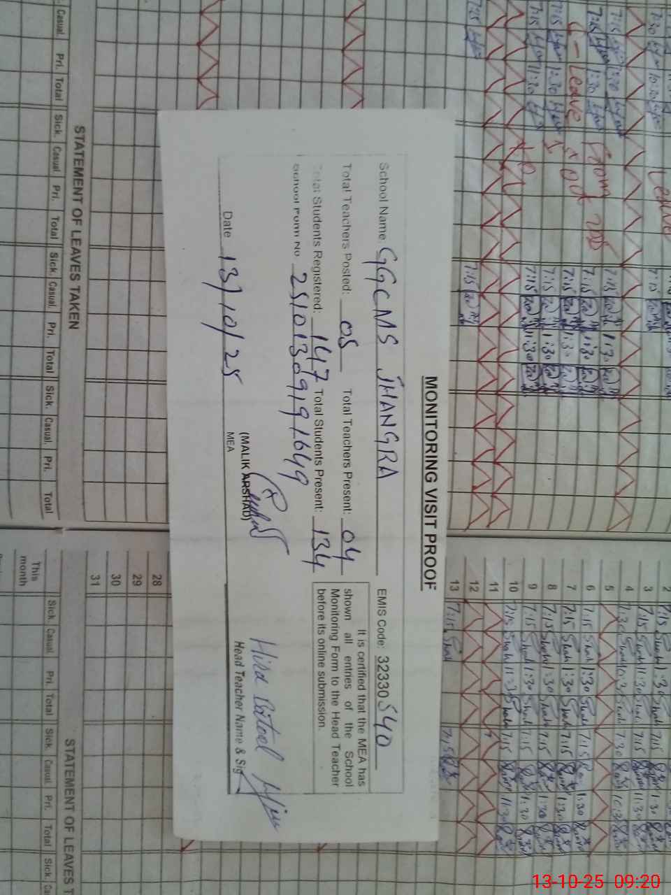 | Attendance Register | Head Teacher | MEA with School | Visit Proof |