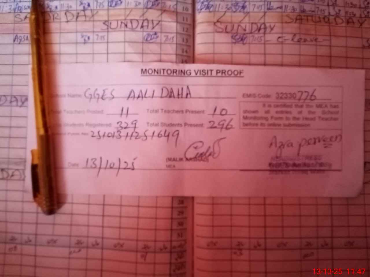 | Attendance Register | Head Teacher | MEA with School | Visit Proof |