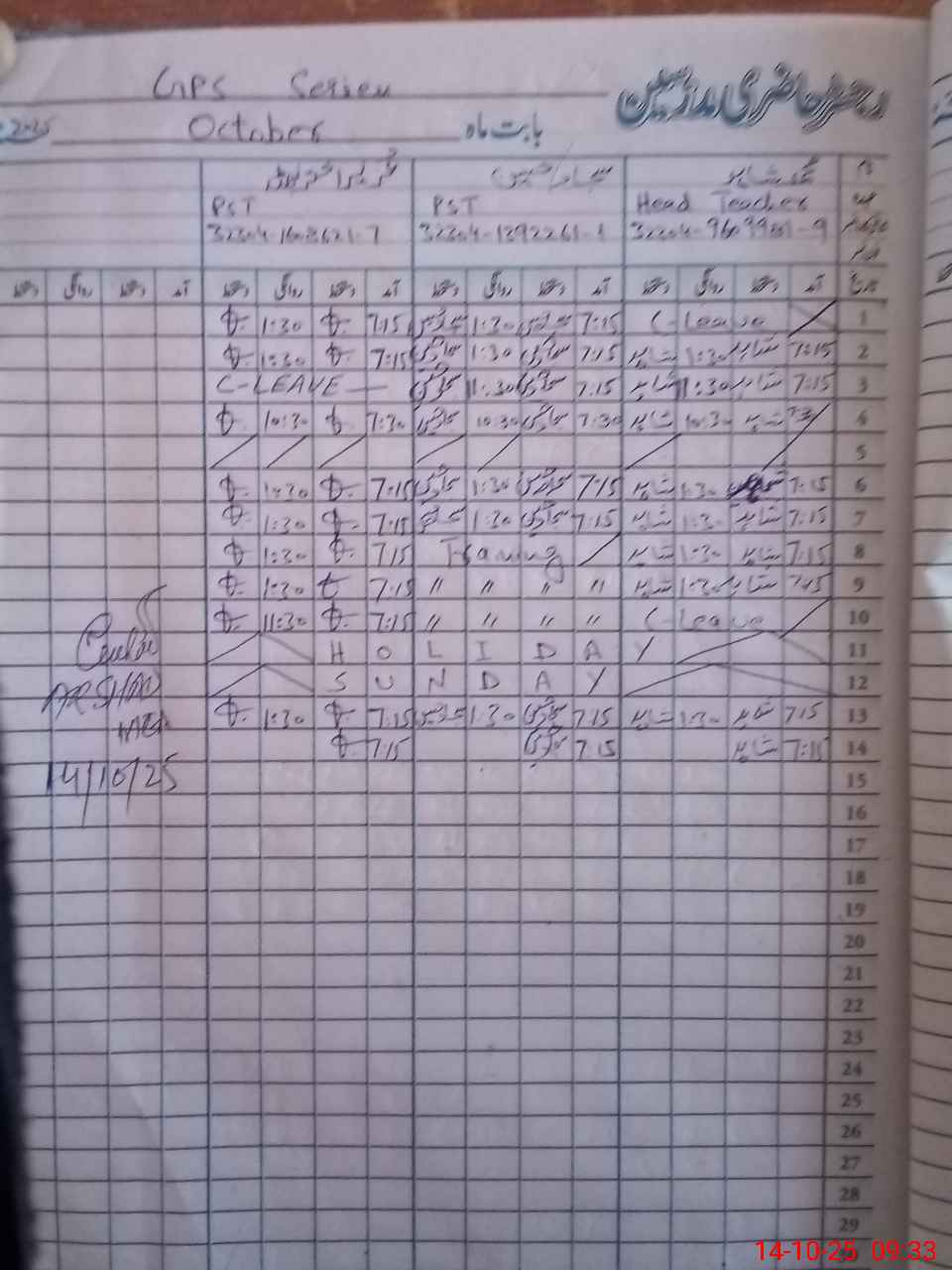 | CNIC | Full Name | Designation | R/C | Absence During Last Calender Month |
