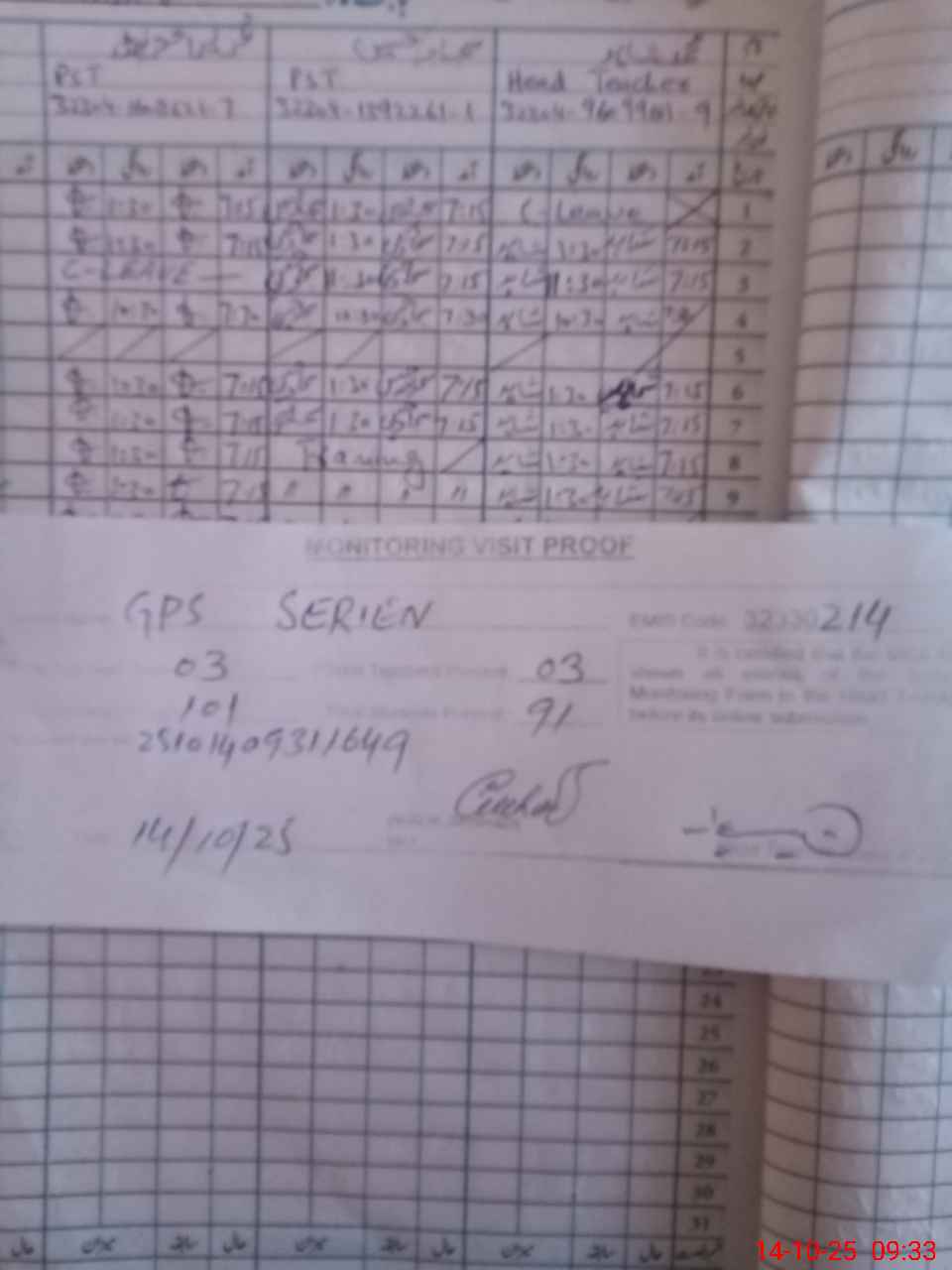 | Attendance Register | Head Teacher | MEA with School | Visit Proof |