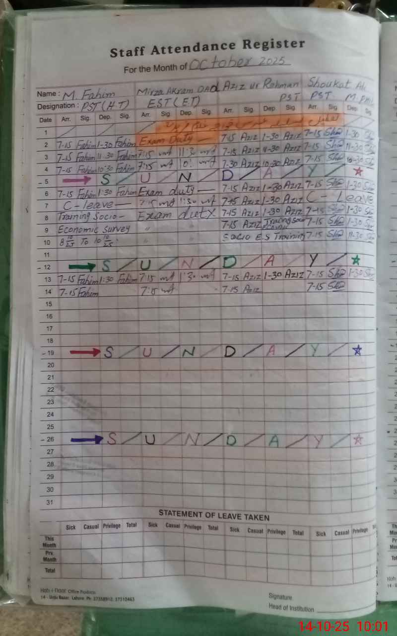 | CNIC | Full Name | Designation | R/C | Absence During Last Calender Month |