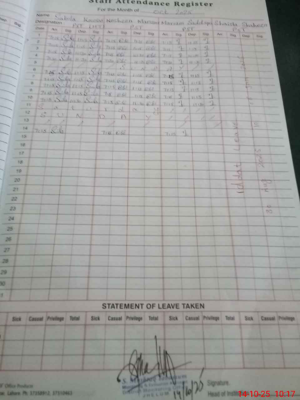 | CNIC | Full Name | Designation | R/C | Absence During Last Calender Month |