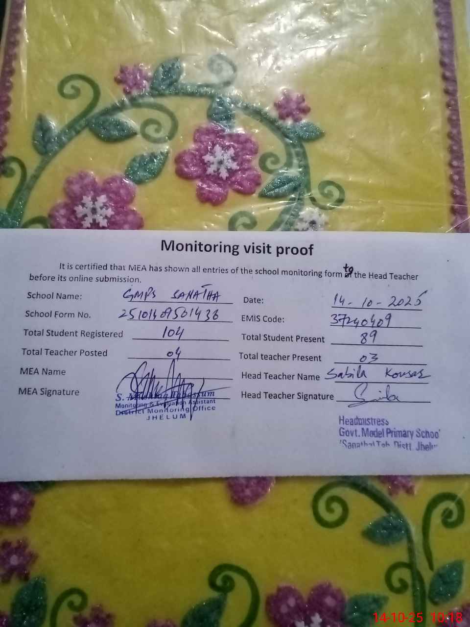 | Certified that this School was Inspected by the Undersigned MEA/DMO Today and the Information Stated Above is as Per Record. | |||||