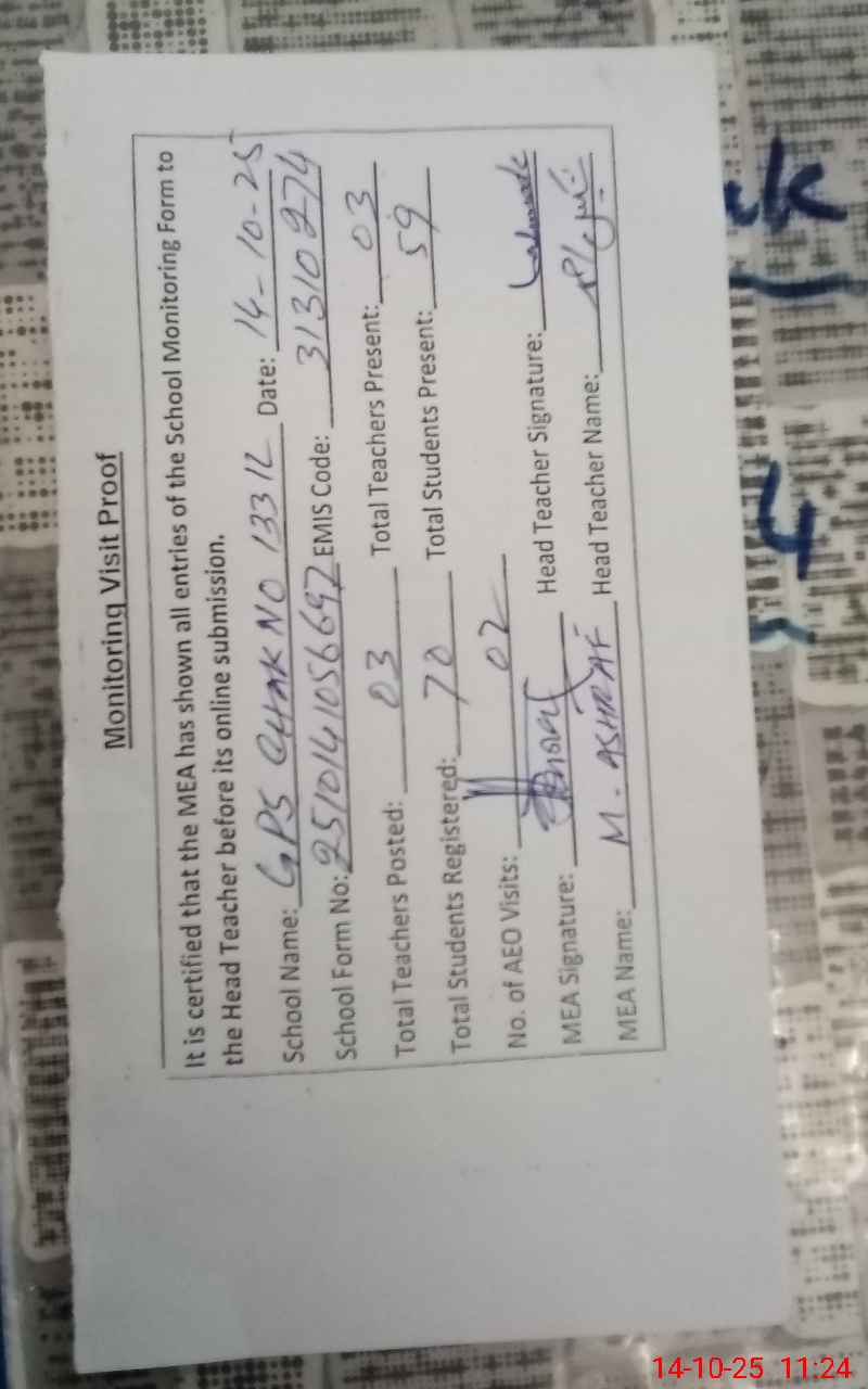 | EMIS Code: 31310274 | Name of School: GPS CHAK NO. 133/1-L | |||
