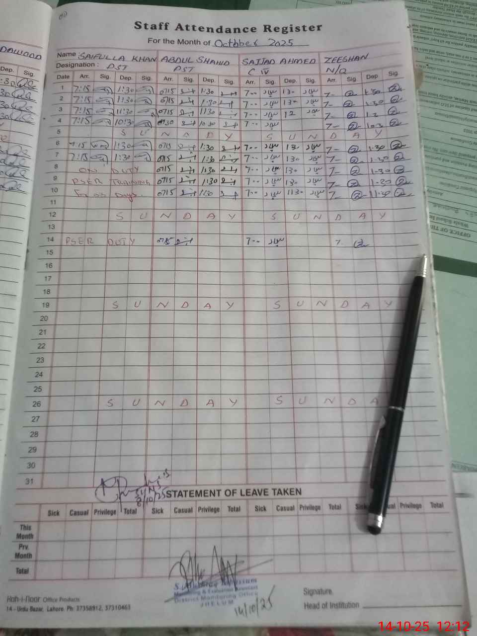 | Remarks (Use Separate Page if Required): Saifullah Khan PST is on PSER duty | |||||