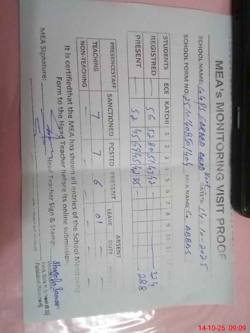 | Attendance Register | Head Teacher | MEA with School | Visit Proof |